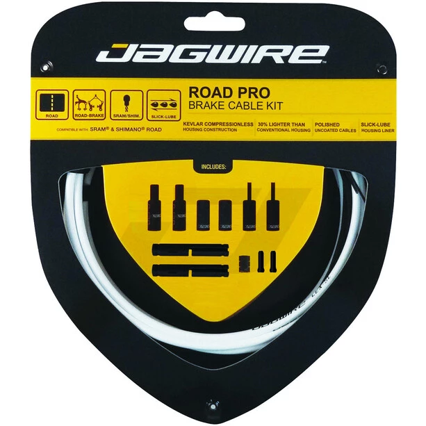 Les rames Road Pro Brake convainquent par leur poids, leurs performances et leur apparence. Avec le revêtement Slick-Lube, les nouveaux câbles polis Pro Level sont synonymes d’une réduction optimale des frottements. En même temps, les manchons extérieurs sans compression avec renfort en kevlar assurent un freinage direct et puissant. Les rames Road Pro sont également très faciles à monter car toutes les pièces nécessaires sont incluses dans la livraison. Les câbles Pro Level polis avec une finition dorée, combinés à des garnitures de lubrification lisses et des manchons extérieurs renforcés de kevlar, améliorent sensiblement les performances de freinage.
