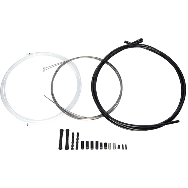 Le kit contient deux câbles de frein en acier inoxydable à revêtement transparent, des gaines de câble de frein sans compression et des embouts en aluminium.